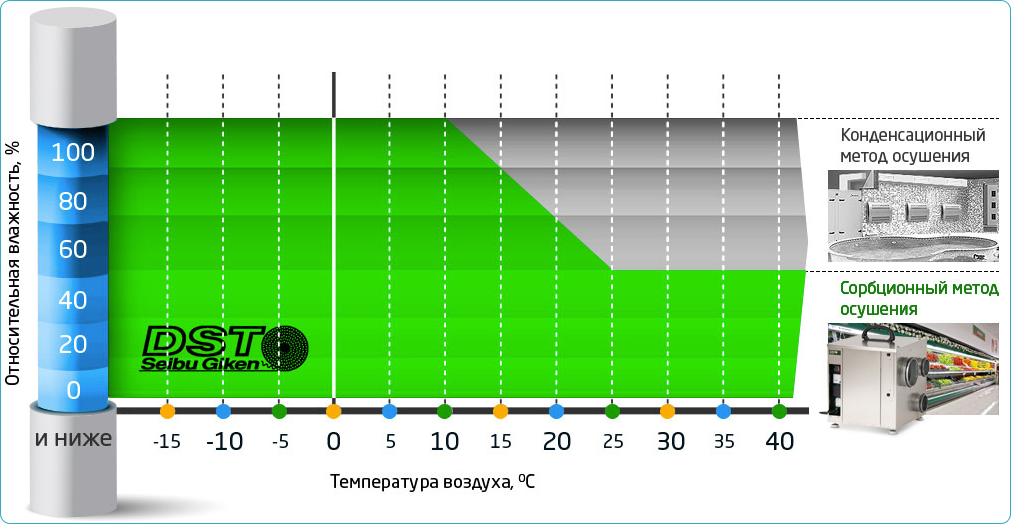 В случае, если в помещении при комнатных температурах необходимо поддержание очень сухого климата – относительная влажность 1-40%, либо если необходимо поддерживать влажность в суровом и холодном климате – температура от +15 до -40°C, а также если нужно осушить очень большие пространства, то в этом случае конденсационные осушители уже не справляются. В этих случаях максимально эффективны адсорбционные осушители воздуха – осушители DST Seibu Giken.